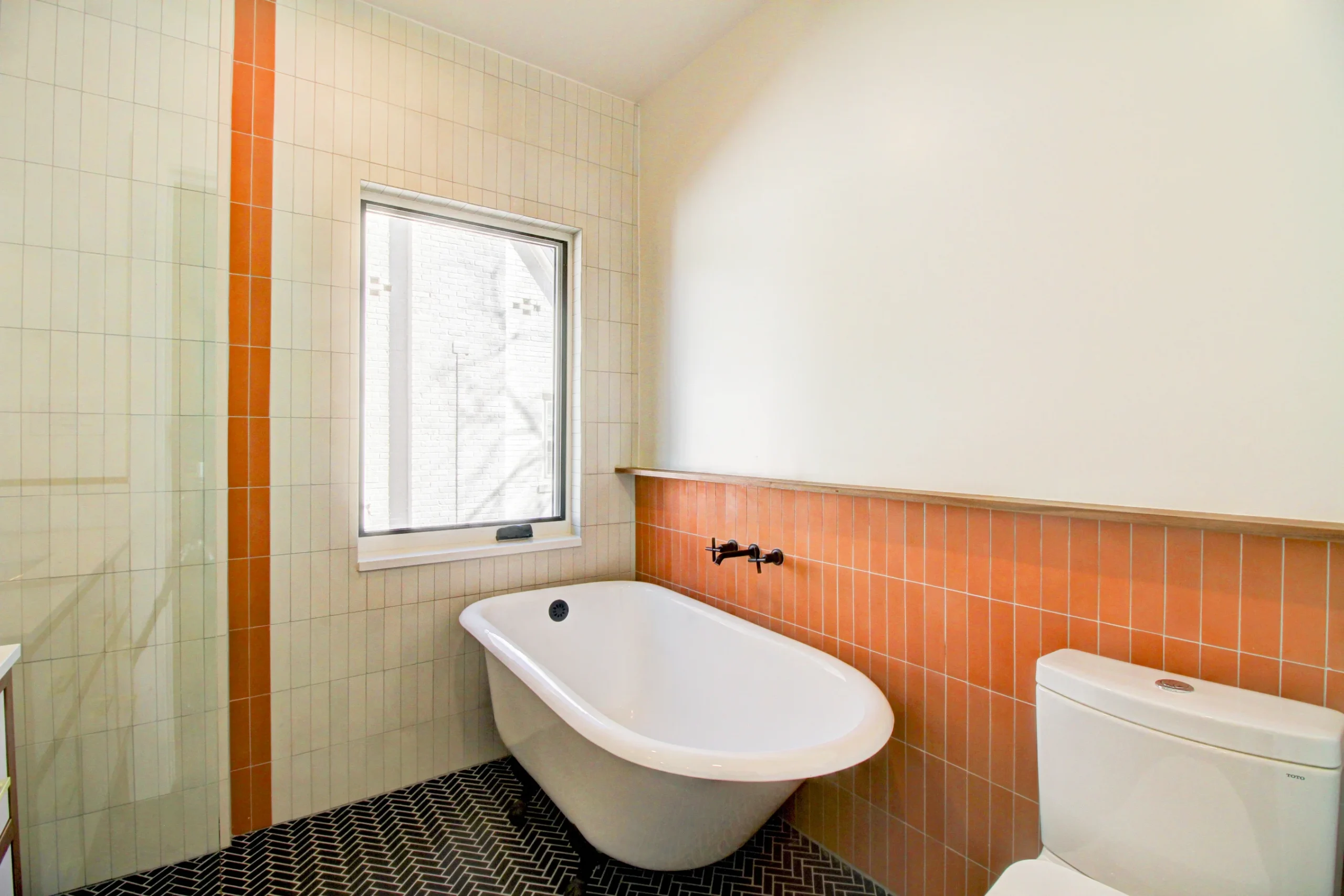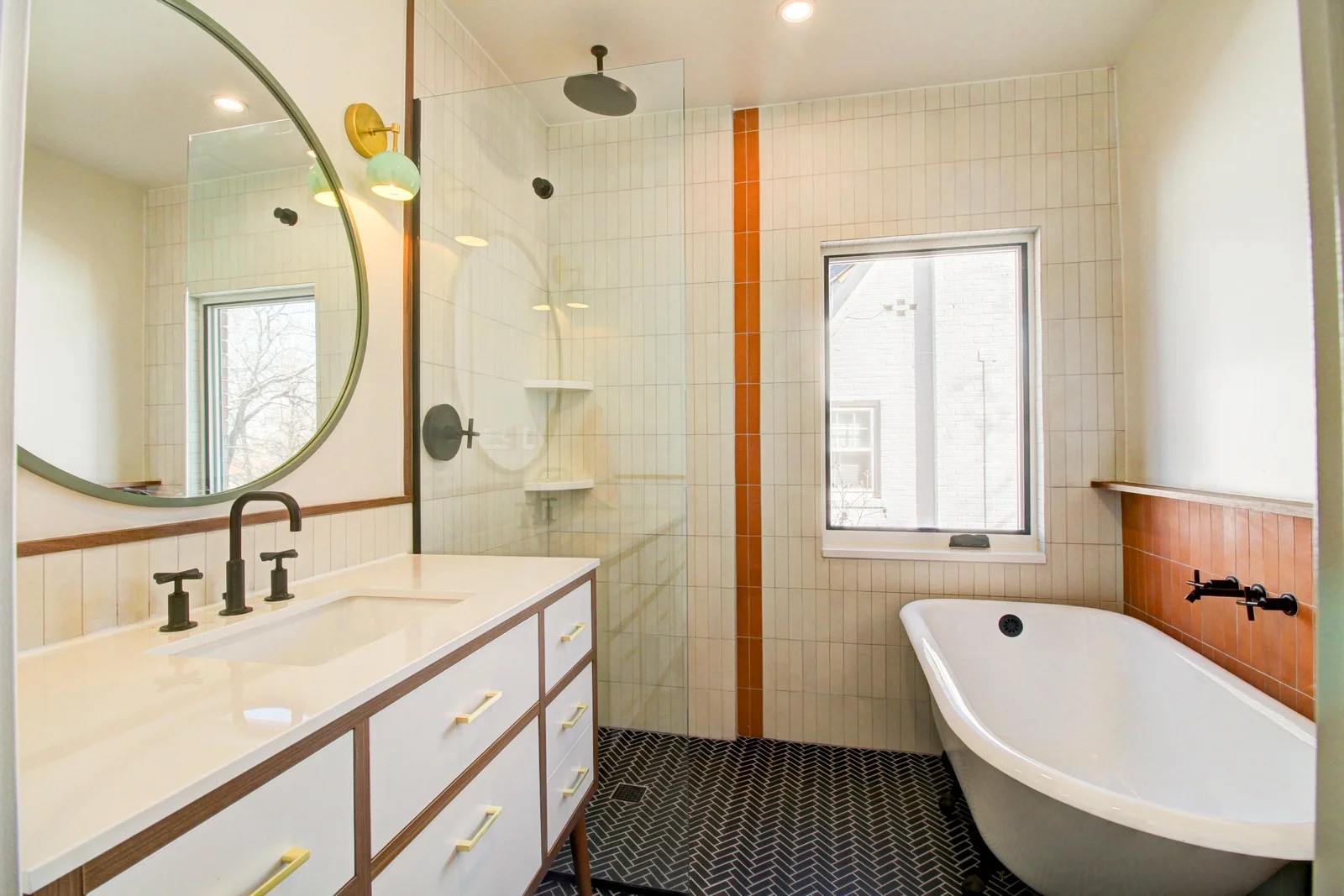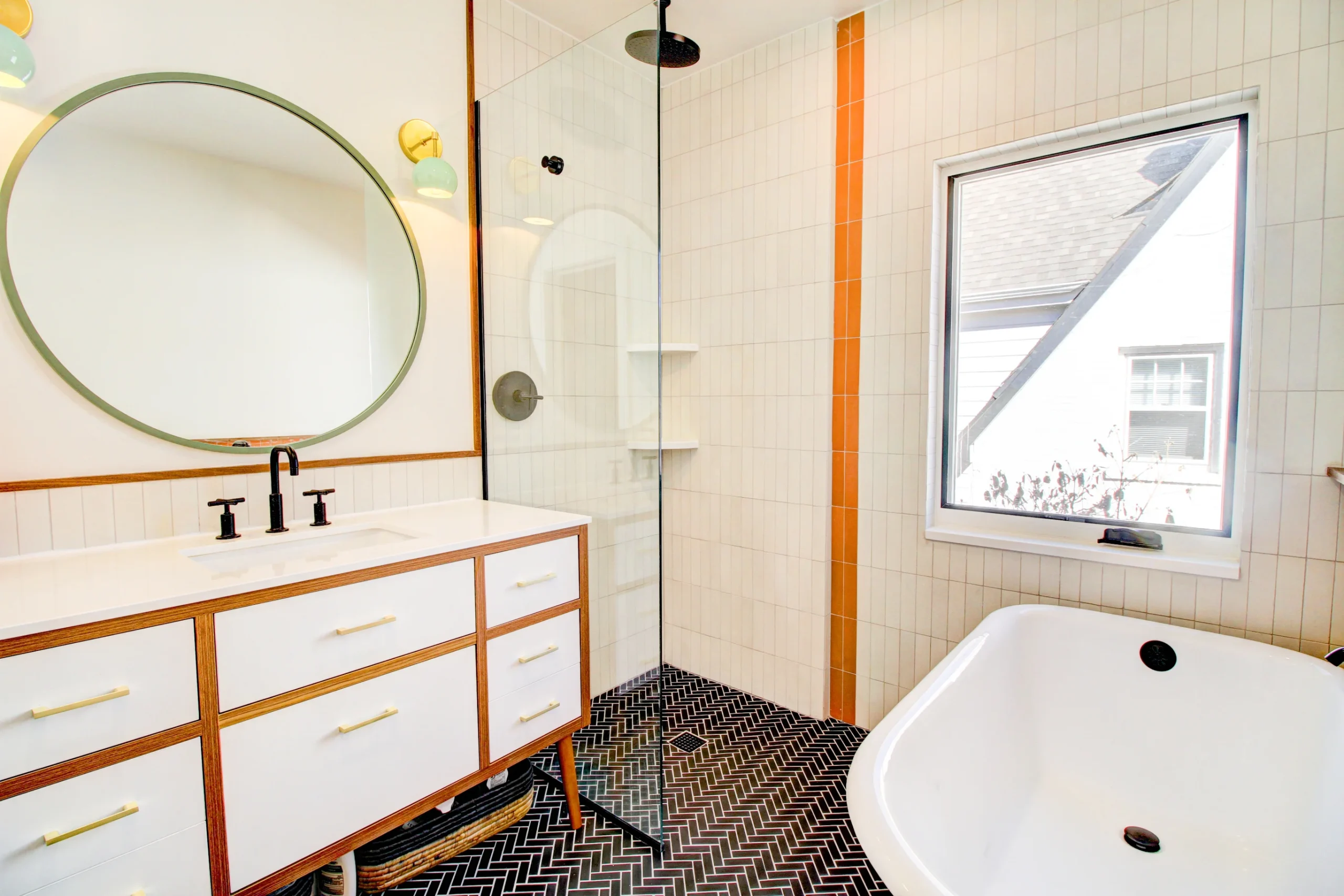 Our team worked closely with Jason’s architect to ensure the space could accommodate his wishlist, including a freestanding tub and zero-entry shower. Together, we meticulously planned the plumbing layout, which required extra coordination and some drywall repair in the dining room below. The end result was a beautifully modern bathroom with luxurious details, high functionality, and lasting quality delivered by Prime Craft Renovation.